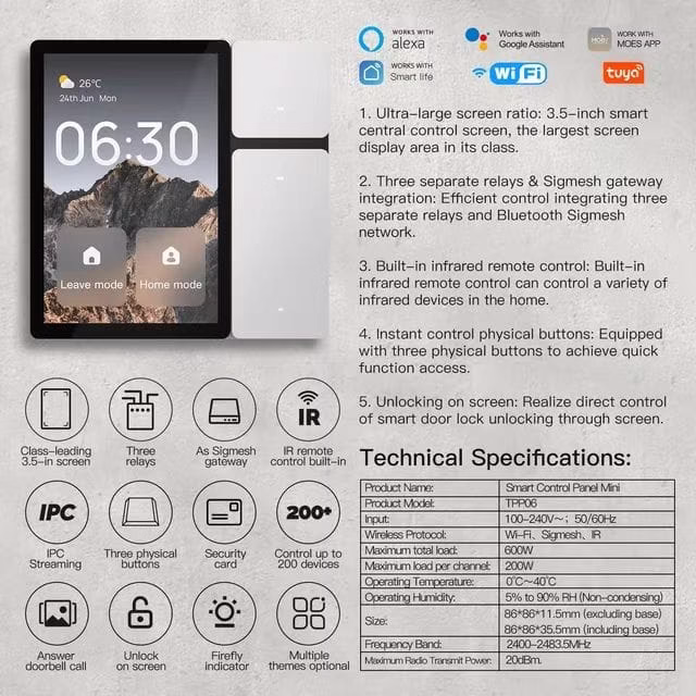 - MULTI FUNCTION: Upgraded central control screen is compatible with more than 410,000 for TUYA products and can control up to 20 types of products, such as smart doorbell, light, curtain, socket, etc.